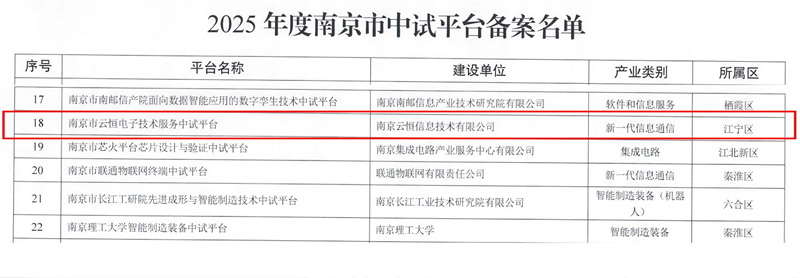 日前,据南京市科学技术局《关于公布2025年度南京市中试平台备案名单的通知》(宁科通〔2025〕69号),华瑞智汇产研生态社区入园企业——南京云恒信息技术有限公司凭借在电子技术服务领域的专业能力与创新生态构建成果,成功入选2025年度南京市中试平台备案名单。