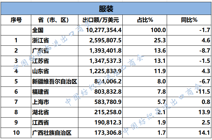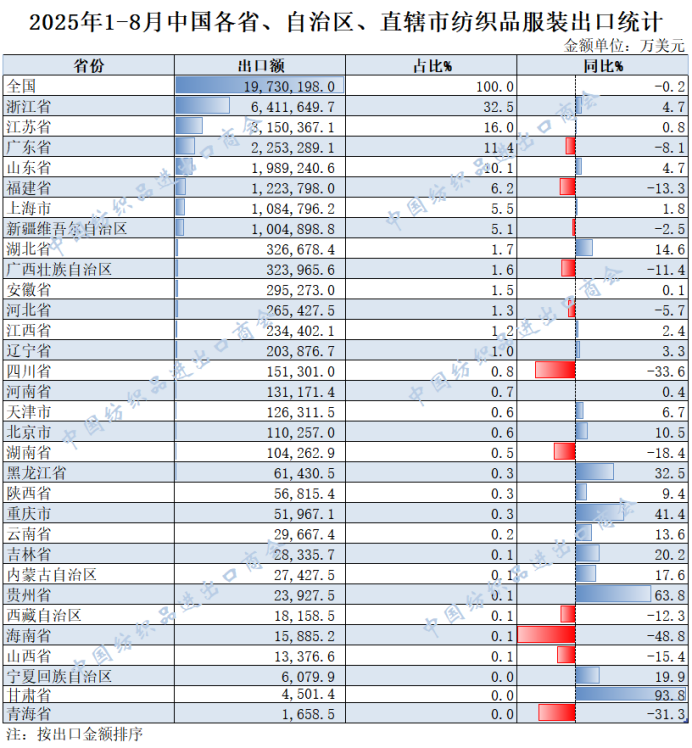 2025年1-8月,我国纺织服装累计出口1973.02亿美元,同比下降0.2%。浙江省、江苏省、广东省、山东省、福建省分别列全国纺织服装出口省市前五位,合计比重超七成。